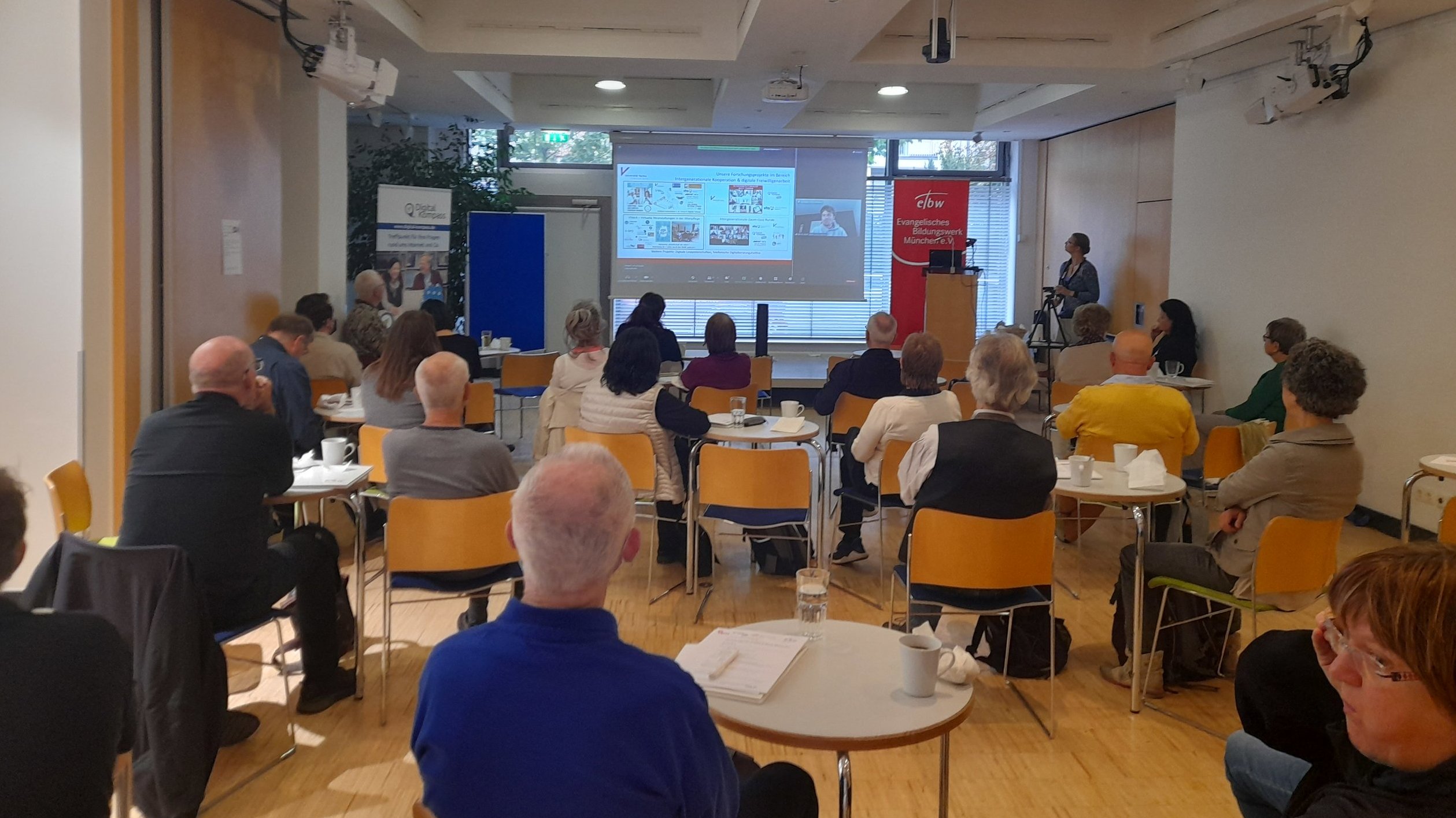 In diesem Jahr kamen am 24. September 2022 etwa dreißig ehrenamtlich und hauptamtlich Lehrende und Beratende in der Arbeit mit Seniorinnen und Senioren im Evangelischen Bildungswerk München hybrid zusammen. Der Fachtag ist eine Kooperationsveranstaltung des Evangelischen Bildungswerks München (ebw) und der Evangelischen Arbeitsgemeinschaft Medien (eam), Digital-Kompass-Standort München. Konzipiert und geleitet wird der Fachtag von Annette Hüsken-Brüggemann (ebw) und Sabine Jörk (eam).